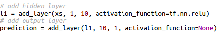 prediction = add_layer(l1, 10, 1, n_layer=2, activation_function=None)